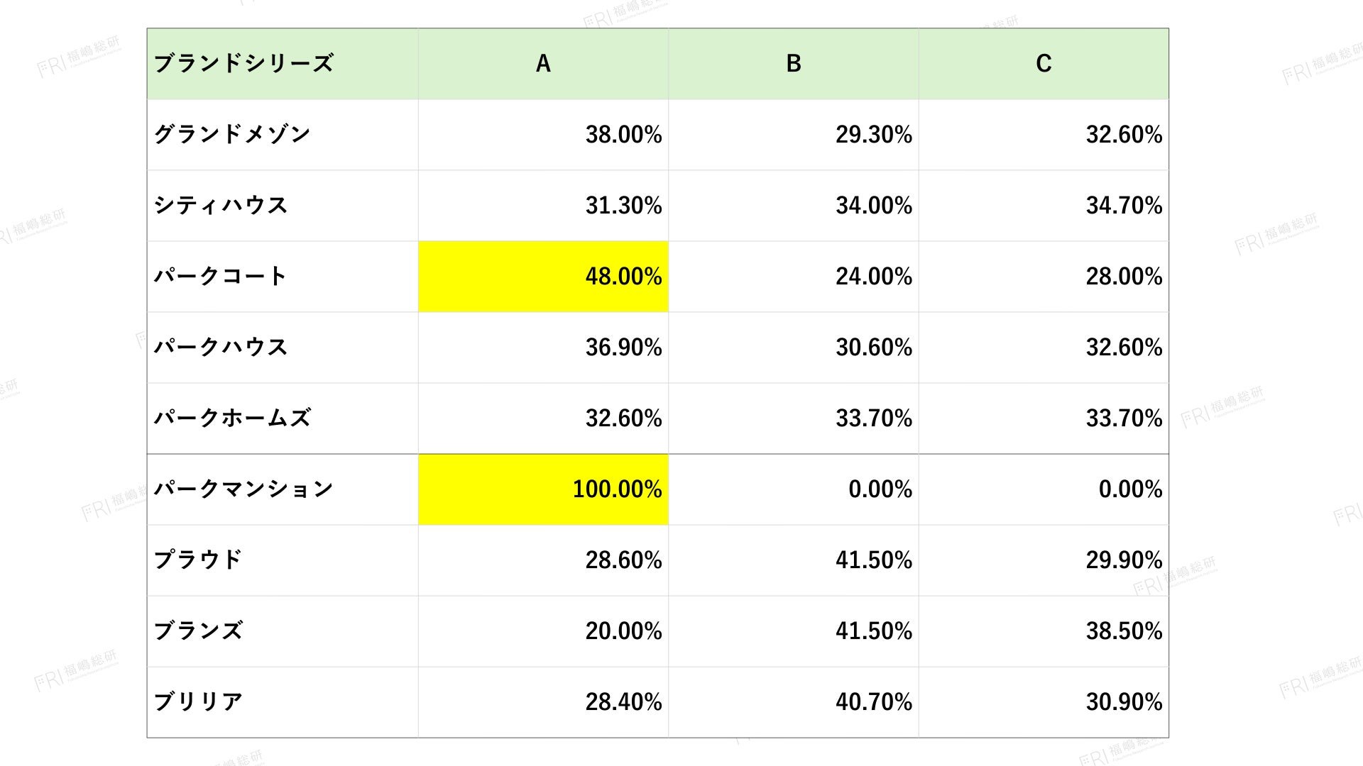 中でも、パークマンションは全住戸がA評価(20%以上のプレミアム)となり、100%が明確な超過価値を維持している点が特筆されます。また、パークコートについてもA評価の割合が著しく高く、上位ブランドとしての安定した価格支配力が確認されました。