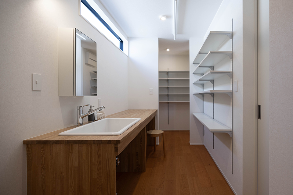 行き止まりのない動線設計、コンパクトな水回りの配置、玄関からパントリー・キッチンへつながる荷物導線など、日常の“家事のムダ”を解消する工夫を随所に。