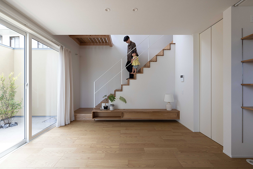 外からの視線を遮りながらも光と風をたっぷりと取り込む中庭が、家族の時間を包みます。朝のコーヒー、子どもの遊び、夜の静かなひととき--都市部でありながら、自然とのつながりを感じられる場所に。