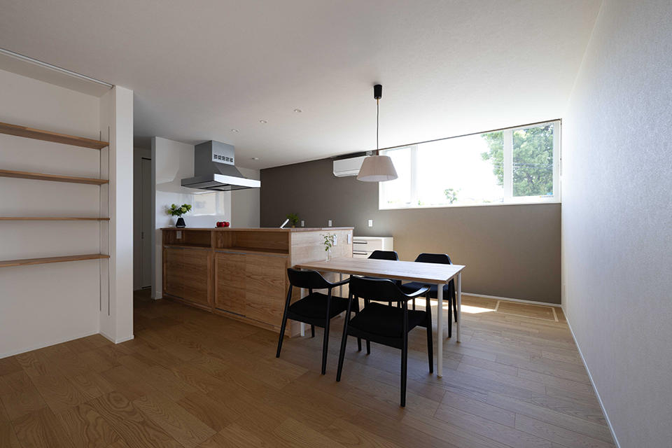 都市部にありながら、室内に風と光が流れ込み、窓の外の視線も気になりにくい工夫を凝らしています。塗り壁と木の素材感も合わさり、空間に呼吸が生まれます。