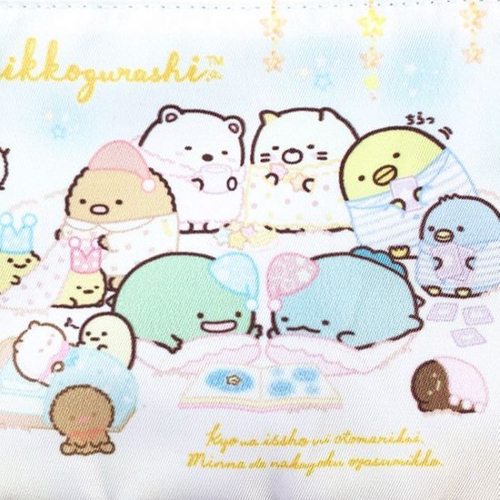 フカフカの枕とお菓子を持ち寄ってお泊り会を楽しむすみっコたちがかわいいデザイン。色はゆめかわなパープルです♡