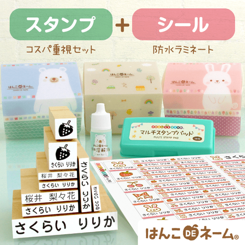 ■セット内容:防水お名前シール、スタンプ9本、マルチスタンプパッド、インク溶解液、収納ケース(デコシールつき)