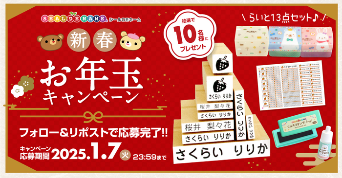 入園・入学準備グッズのECサイト「シールDEネーム」を運営する株式会社サンアドシステム(本社:大阪府大阪市、代表取締役:山根 昭二)は、公式X(旧Twitter)アカウントにて「らいと13点セット」のリニューアルを記念した「フォロー&リポストキャンペーン」を2025年1月1日(水)から1月7日(火)まで実施します。