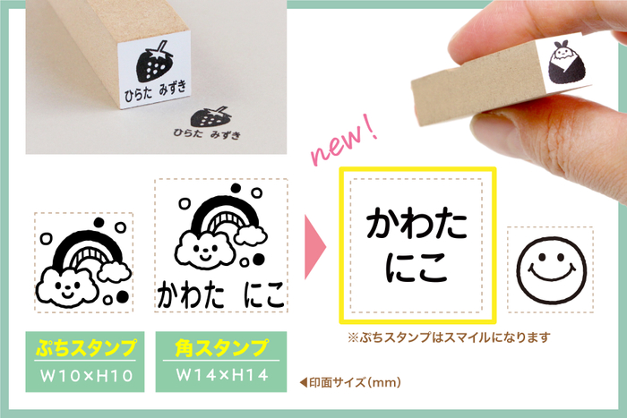 文字が一緒にはいった“角スタンプ”はイラストとお名前の組み合わせとなっておりますが、マイマークが必要ではない年齢の保護者さまから「イラスト入りは使い道が少ない。」とのお声をいただいたため《イラストなし》を選択できるようにリニューアルいたしました。