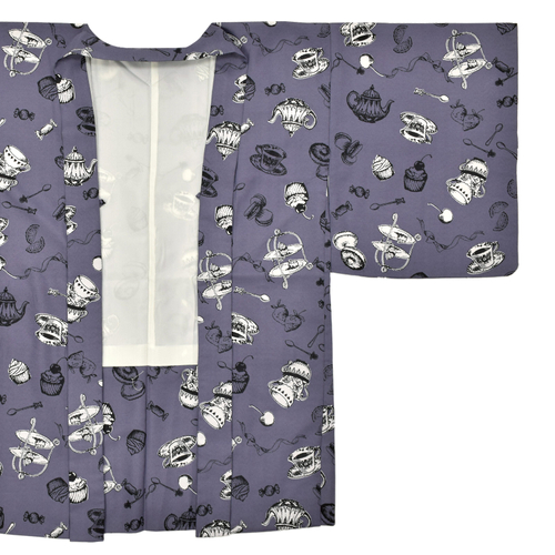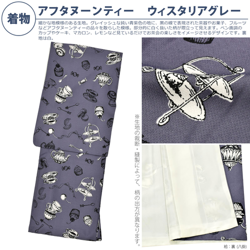 グレイッシュな鈍い青紫色の地に、黒の線で表現された茶器やお菓子、フルーツなどアフタヌーンティーの品々を散らした模様。部分的に白く抜いた柄が際立って見えます。ペン画調のカップやケーキ、マカロン、レモンなど見ているだけでお茶会の楽しさをイメージさせるデザインです。裏地は白。