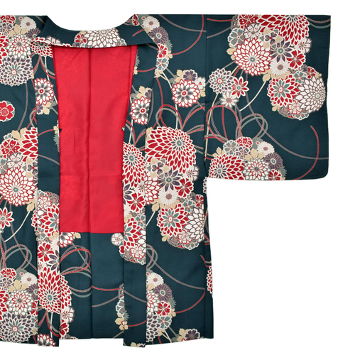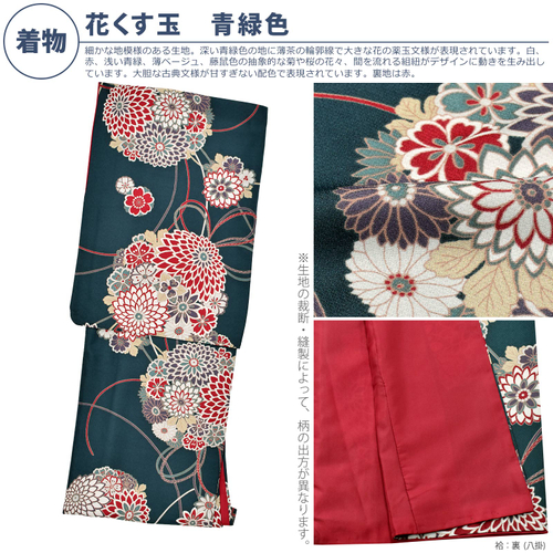 深い青緑色の地に薄茶の輪郭線で大きな花の薬玉文様が表現されています。白、赤、浅い青緑、薄ベージュ、藤鼠色の抽象的な菊や桜の花々、間を流れる組紐がデザインに動きを生み出しています。大胆な古典文様が甘すぎない配色で表現されています。裏地は赤。
