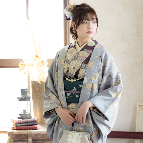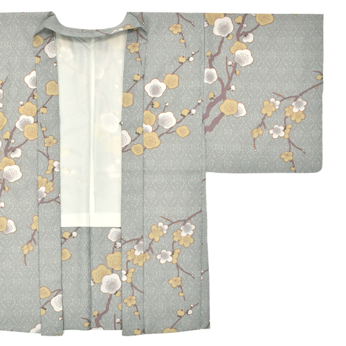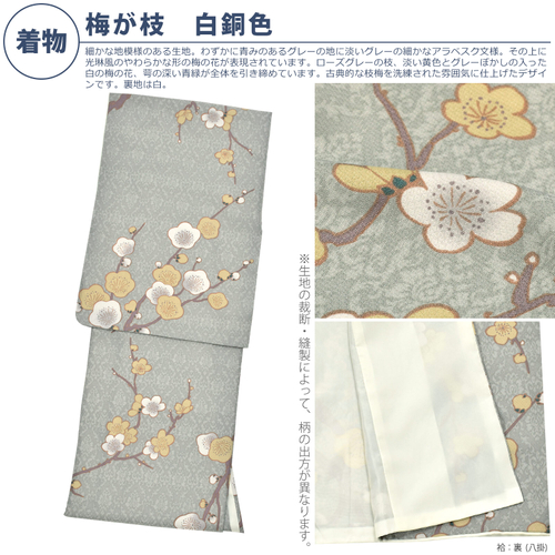 わずかに青みのあるグレーの地に淡いグレーの細かなアラベスク文様。その上に光琳風のやわらかな形の梅の花が表現されています。ローズグレーの枝、淡い黄色とグレーぼかしの入った白の梅の花、萼の深い青緑が全体を引き締めています。古典的な枝梅を洗練された雰囲気に仕上げたデザインです。裏地は白。