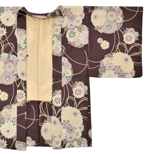 グレイッシュな赤みの茶色地に薄茶の輪郭線で大きな花の薬玉文様が表現されています。浅い黄色、鈍い薄紅色、白、青緑、グレーの抽象的な菊や桜の花々、間を流れる組紐がデザインに動きを生み出しています。華やかな古典文様が現代的なやわらかい配色でまとめられています。裏地はベージュ。