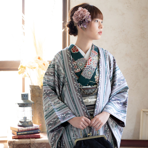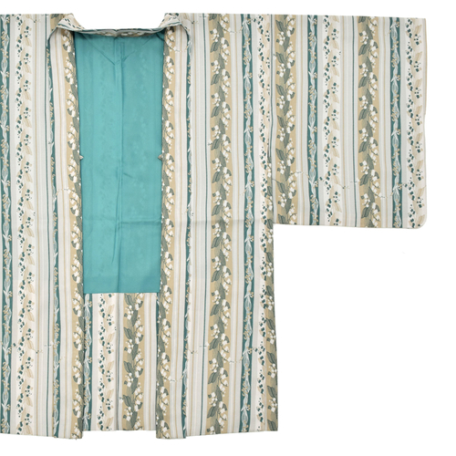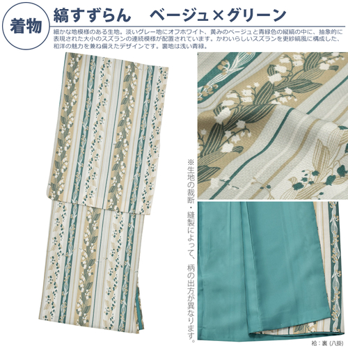 淡いグレー地にオフホワイト、黄みのベージュと青緑色の縦縞の中に、抽象的に表現された大小のスズランの連続模様が配置されています。かわいらしいスズランを更紗縞風に構成した、和洋の魅力を兼ね備えたデザインです。裏地は浅い青緑。
