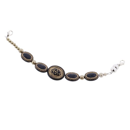 黒地に縦縞に構成された柄。半分はグレージュにアイボリーの雲龍文様、もう半分は黒地にアイボリーの唐花文様を中心に、グレージュ、臙脂色、錆浅葱色の縞文様。中性的な雰囲気が格好良いデザインです。
