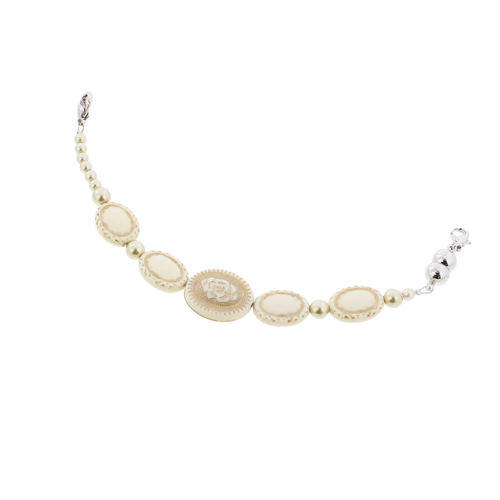 焦茶色に、黒鳶色の太い一本縞の通った地。アイボリー、グレージュのスクエア型のレースを繋げた模様。まるで本物のレース編みのような繊細で華やかなモチーフが織り出されています。裏地はアイボリー。