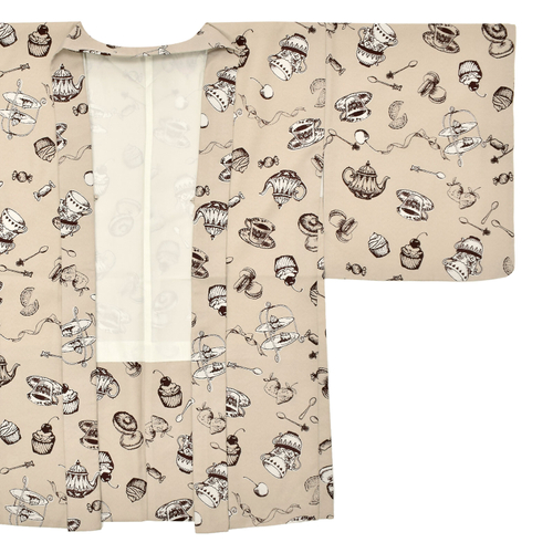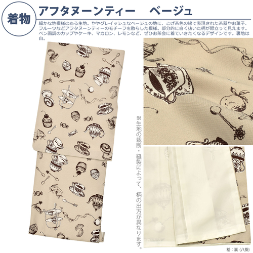 ややグレイッシュなベージュの地に、こげ茶色の線で表現された茶器やお菓子、フルーツなどアフタヌーンティーのモチーフを散らした模様。部分的に白く抜いた柄が際立って見えます。ペン画調のカップやケーキ、マカロン、レモンなど、ぜひお茶会に着ていきたくなるデザインです。裏地は白。