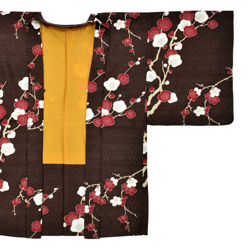 やや赤みのこげ茶色の地に淡いこげ茶の細かなアラベスク文様。その上に光琳風のやわらかな形の梅の花が表現されています。淡いベージュの枝、赤と淡いグレーぼかしの入った白の梅の花、挿し色として入っている萼の浅い青緑がポイントです。古典的な枝梅に異国風の雰囲気を取り入れたデザインです。裏地は山吹茶。