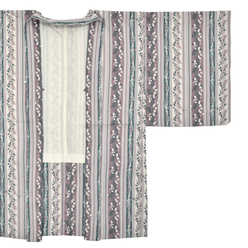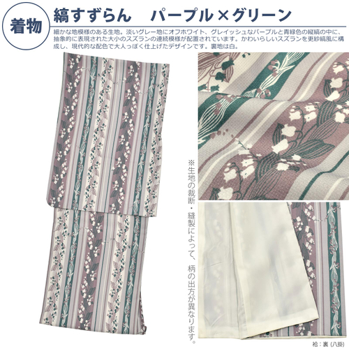 淡いグレー地にオフホワイト、グレイッシュなパープルと青緑色の縦縞の中に、抽象的に表現された大小のスズランの連続模様が配置されています。かわいらしいスズランを更紗縞風に構成し、現代的な配色で大人っぽく仕上げたデザインです。裏地は白。
