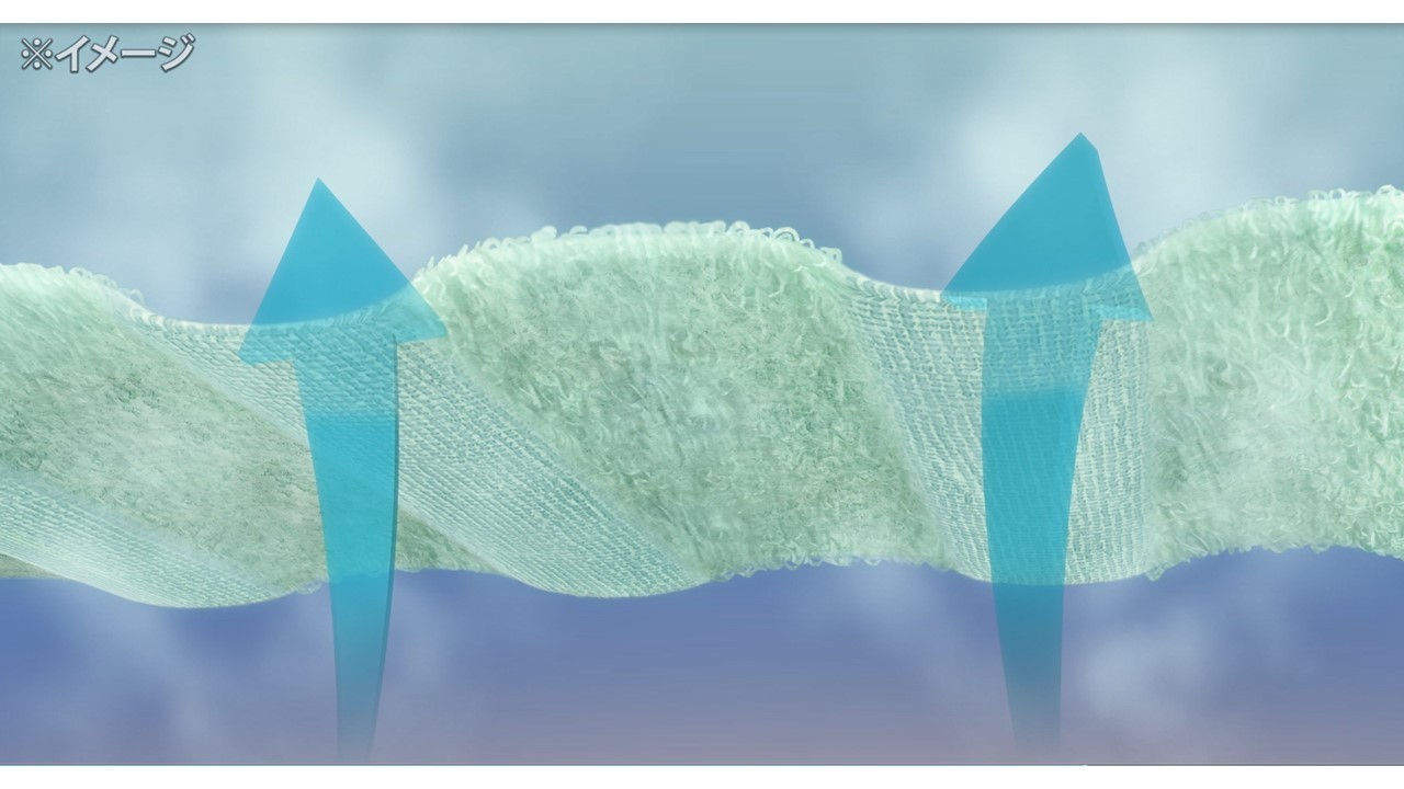 「そよ風ケット」は快眠のために、汗を吸い取るパイル生地とムレを放出するメッシュ生地を交互に配置した特殊構造。体感温度に大きく影響をする湿度をコントロールし、サラッと感が朝まで続きます。さらに、特許取得の特殊な編み技術で実現した「くしゅくしゅ加工」が空気の層をまとい、肌にまとわりつきません。