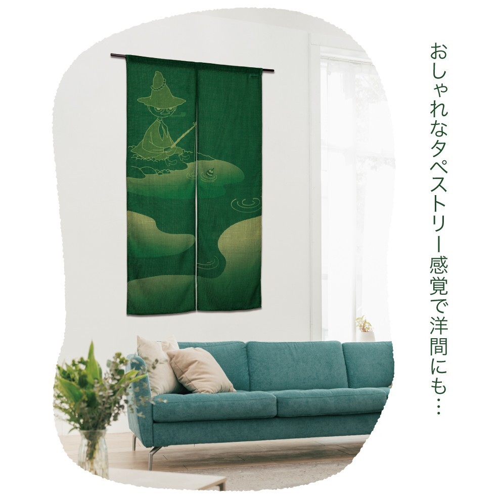 森をゆくムーミンとリトルミイ、釣りをするスナフキン――ムーミン谷の仲間たちを大胆に染め抜いた「のれん」が登場!