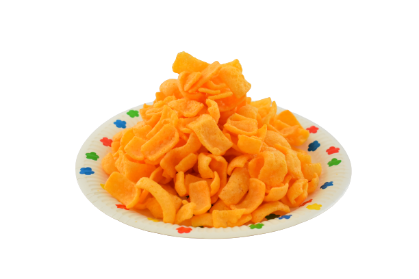 商品特徴:カラッとソフトに植物油でフライしたチーズ味のスナックに、濃口チーズシーズニング(粉末の調味料)をかけて、旨さをアップしました。