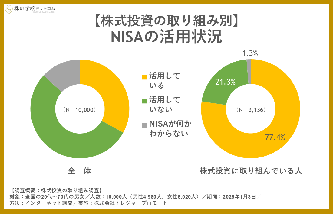 NISAを活用している人の割合は全体で33.0%でしたが、株式投資に取り組んでいる人では、その数値は大きく異なります。