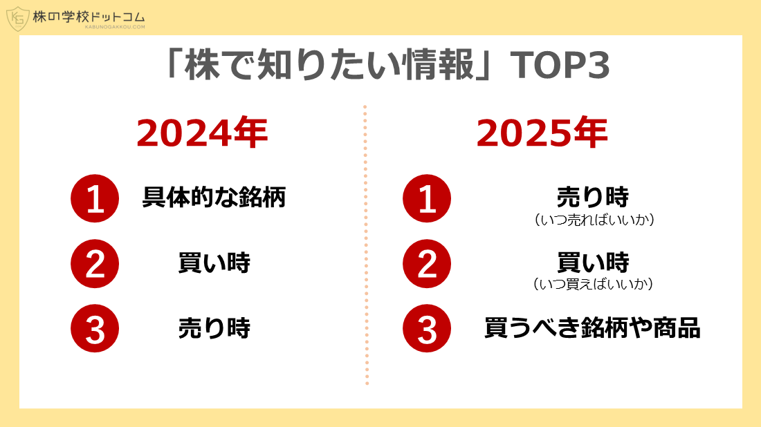 株の学校ドットコムが昨年2月に行った同様の調査では、1位は「銘柄」で、2位「買い時」、3位「売り時」でした。それから1年経って、今回は上位3つが逆転する結果となりました。