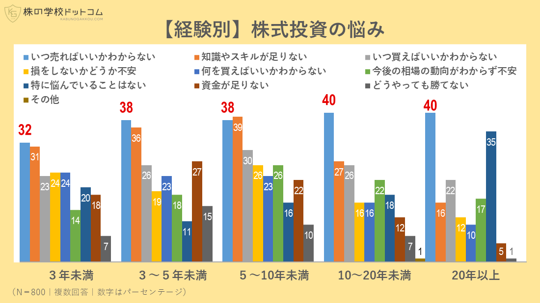 個人投資家の悩みについても経験年数で分類してみたところ、「いつ売ればいいかわからない」はやはり経験年数を重ねても一定の回答を得ており、むしろ10年以上では4割を超えました。
