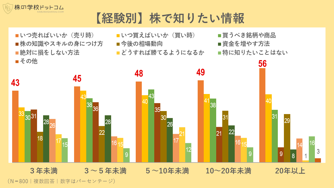 この結果を経験年数で分類してみると、「いつ売ればいいか(売り時)」は、3年未満の初心者から20年以上のベテランまですべてで1位となっており、特に20年を超えるベテランでは56%もの人が選んでいます。