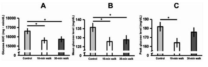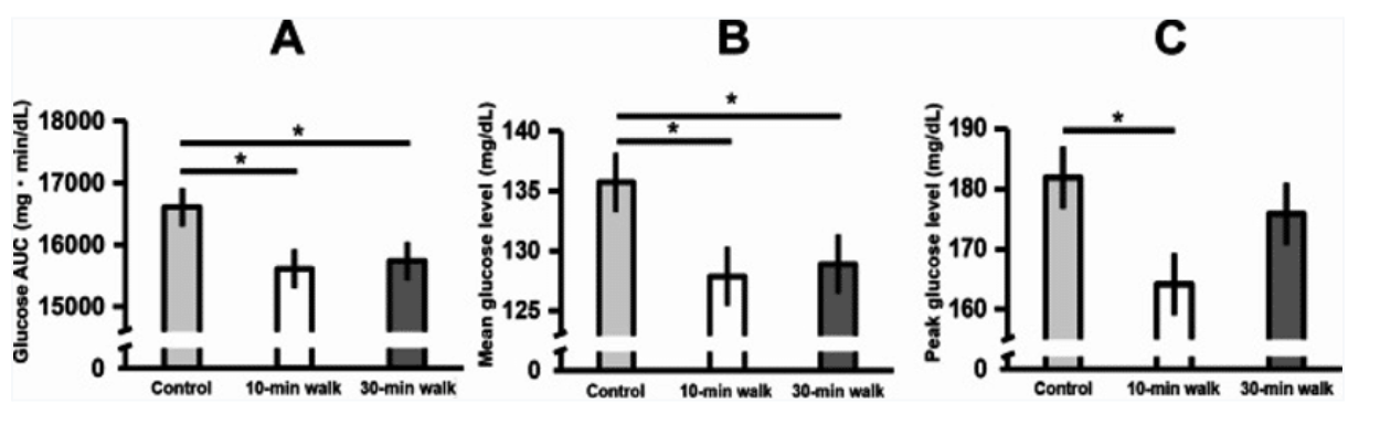 図:食後に運動した場合(灰色・黒)と運動しなかった場合(白)の血糖値推移。食後すぐの10分ウォーキング(灰色)は、運動なし(白)に比べ血糖値の上昇が緩やかで、2時間後までの血糖値曲線下面積や平均血糖値が有意に低下しています。また食後血糖のピーク値も有意に低く抑えられました(※黒は食後30分後から30分歩行した場合で、ピーク抑制効果は灰色より劣る)