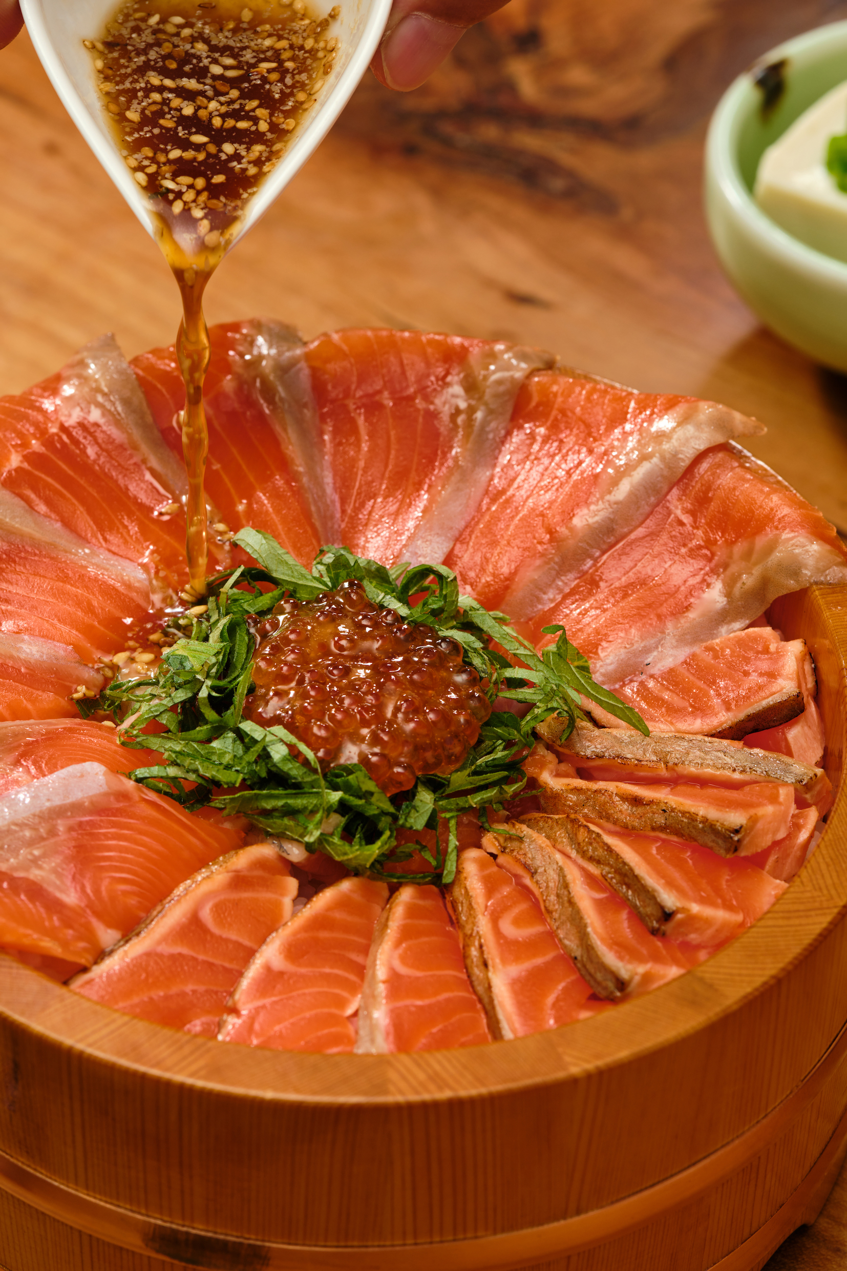 丼ぶりには、鯖街道の行商人にちなんだ「桶」を使い、小浜よっぱらいサバや若狭まはた、ふくいサーモン、小浜で水揚げされたイカなど地元で水揚げされた新鮮な海鮮を使っています。