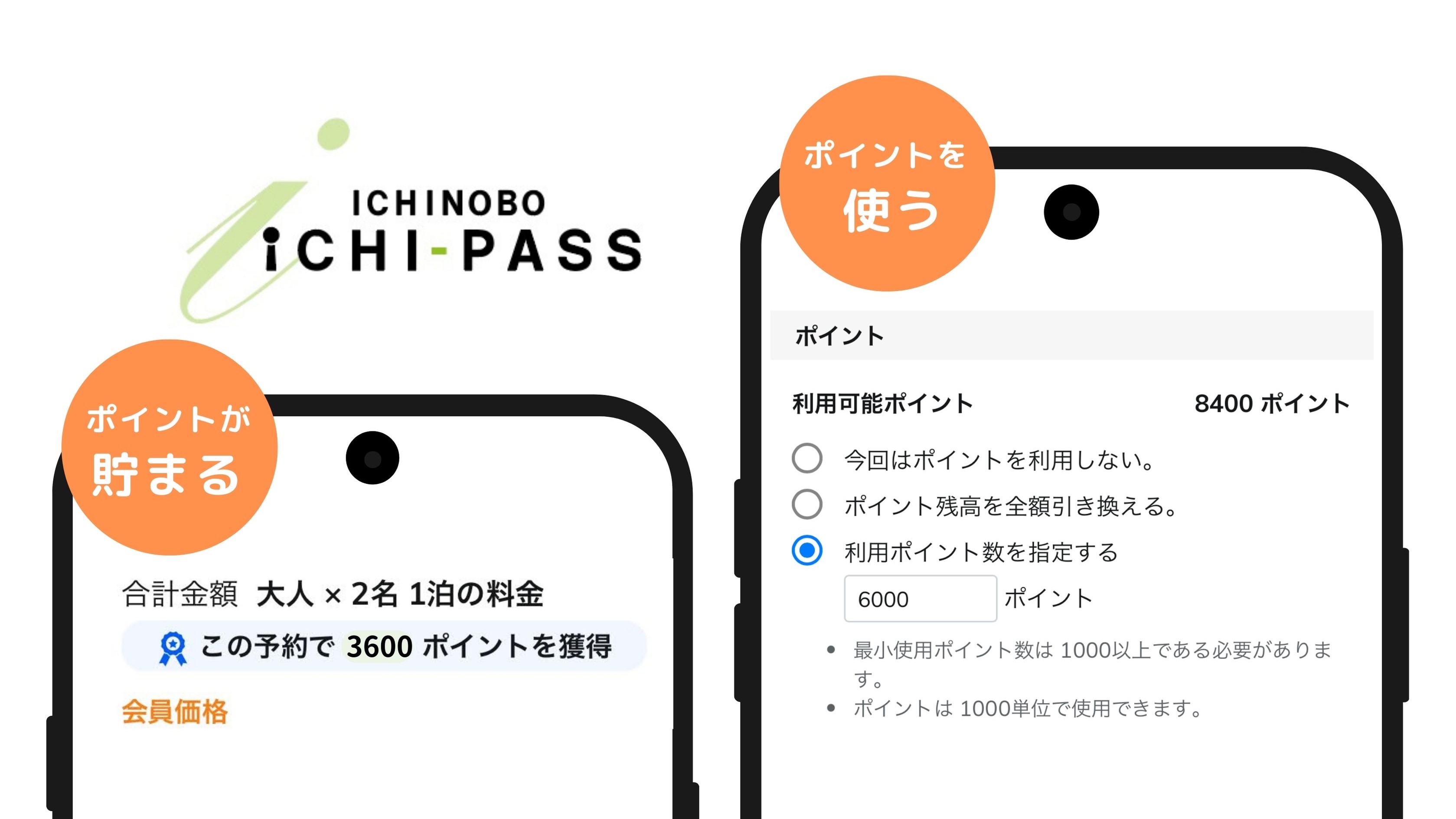 貯まったポイントは1,000ポイント=1,000円分として使用できます。温泉リゾート宿泊予約はICHI-PASSアカウントより宿泊予約するとポイント使用が可能。ご招待やプレゼント旅行のため、宿泊者と予約者が違う場合でも、予約者がポイントを使い、残りをクレジットカードでの事前決済が可能になるなど、旅行サイトのようにポイントが使えます。