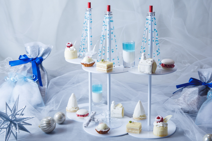 霧氷クリスマスツリーをモチーフにしたケーキスタンドに、霧氷をイメージした全8種類のスイーツを盛り付けます。これらは、霧氷が付着した木をイメージした「ブッシュ・ド・ノエル」、トマムの雪山に見立てた「モンブラン」などのスイーツです。2人用なので、家族や友人と一緒に味わうことができます。また、当テラス内にある屋内カフェの雲Cafeで冷えた身体を温めながら、ゆっくりと霧氷クリスマススイーツを堪能できます。