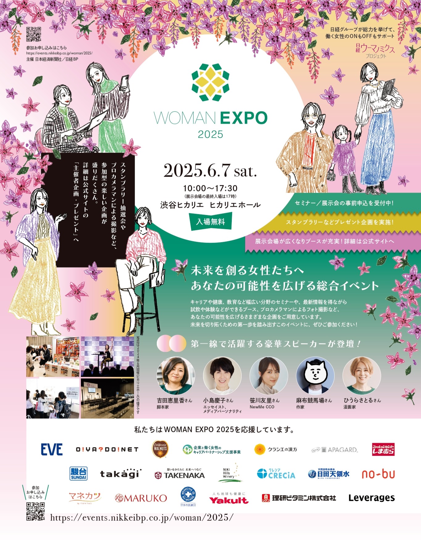 WOMAN EXPOは入場無料ですが、ご来場予定の皆様は公式サイトからの事前申込(セミナーもしくは展示会入場)が必要となります(→ https://events.nikkeibp.co.jp/woman/2025/)。新着情報や、各種プログラムの詳細、各展示ブースの出展内容の詳細についても、公式サイトをご覧ください。