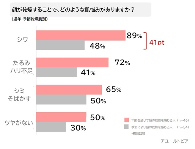 ・「年間を通じて顔の乾燥を感じる人」と「季節により顔の乾燥を感じる人」の悩みを比較すると、「シワ」に関しては41ポイントの差があり、年間を通じて顔の乾燥を感じる人の89%がシワに悩んでいることが分かりました。また72%の人が「たるみやハリ不足」に悩むことも分かりました。