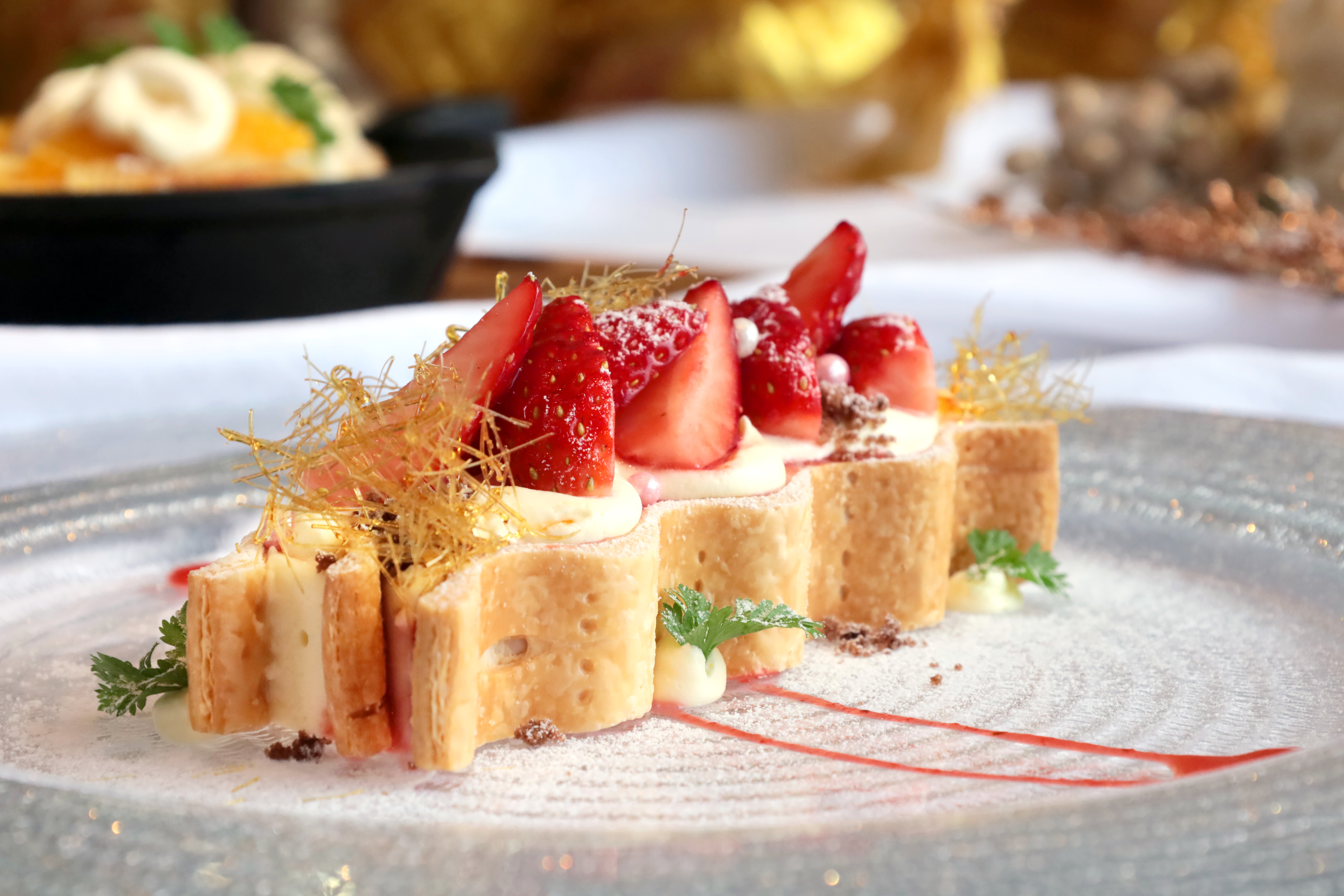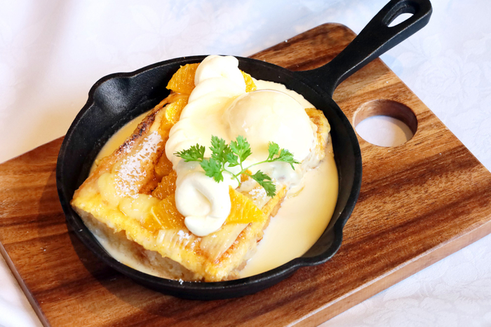 クリスマスメニューはアラカルトでも楽しめ、スイーツにはオレンジのリキュール香る「オランジュ・ブリュレトースト」が登場。熱々のスキレットで提供され、目の前でカスタードクリームを注ぐとジュージューとしたシズル感が楽しめます。