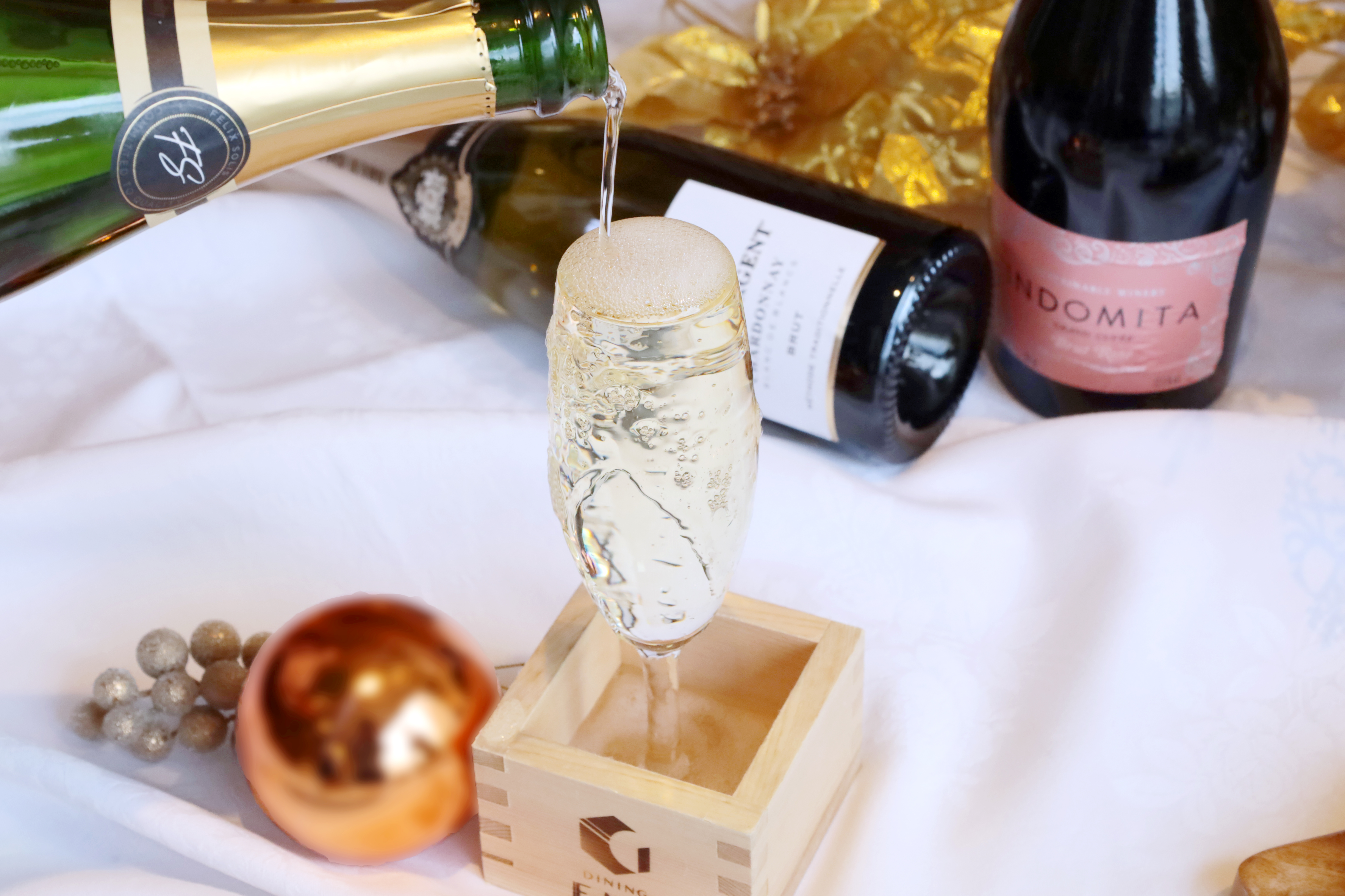 枡にグラスを入れ、こぼれるほどに注ぐスパークリングワイン。見た目も華やかに心躍る乾杯を。