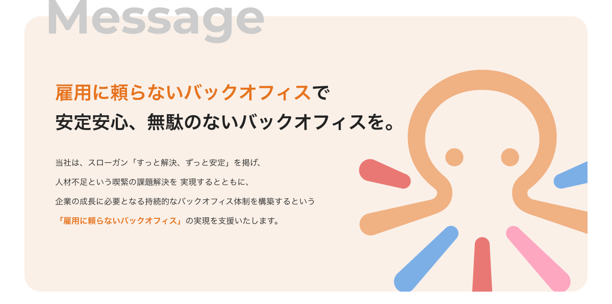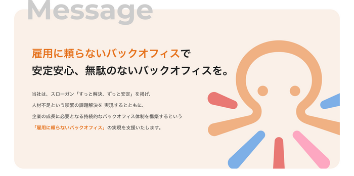 本リニューアルは、サイト来訪者に対して会社が目指す方向性をより強くメッセージとして発信していくことを目的としており、提供価値である「すっと解決、ずっと安定。」及び支援企業に対して「雇用に頼らないバックオフィス」の実現を示したものとなっております。