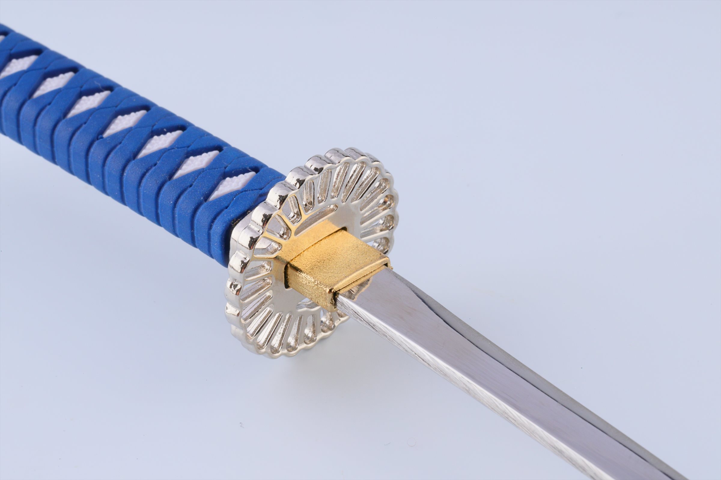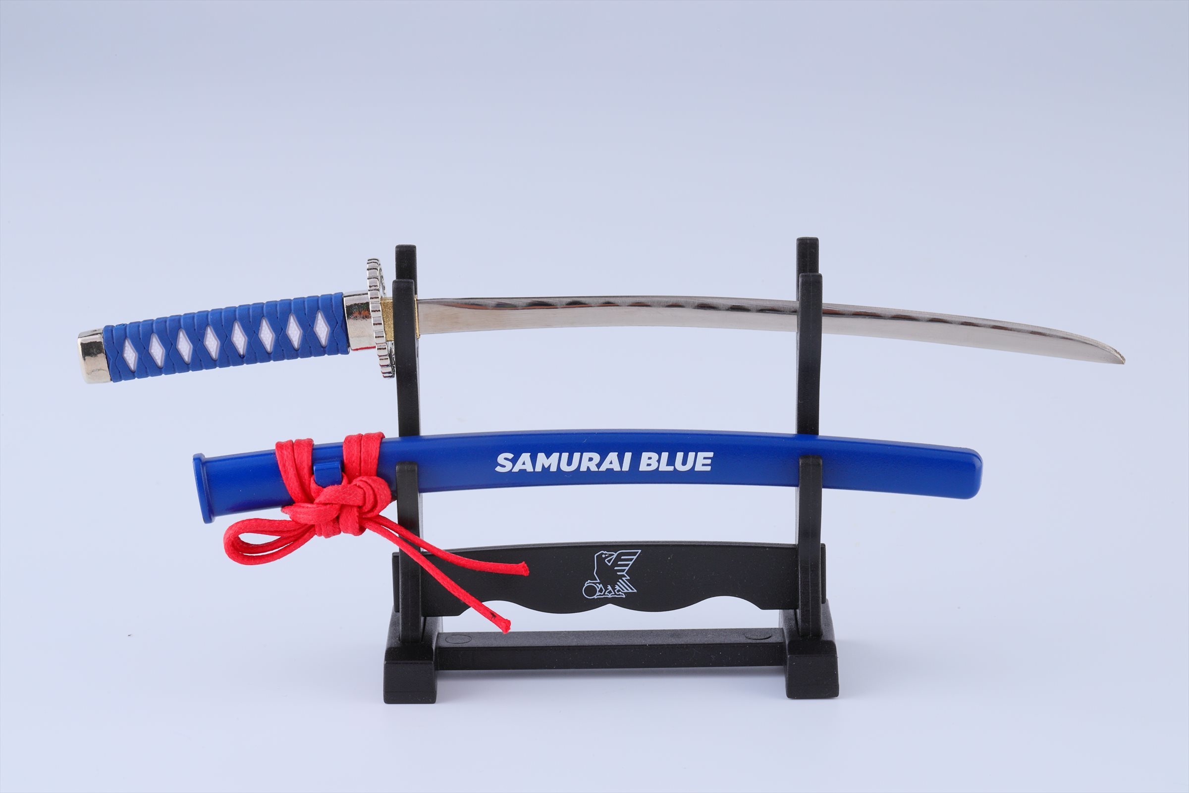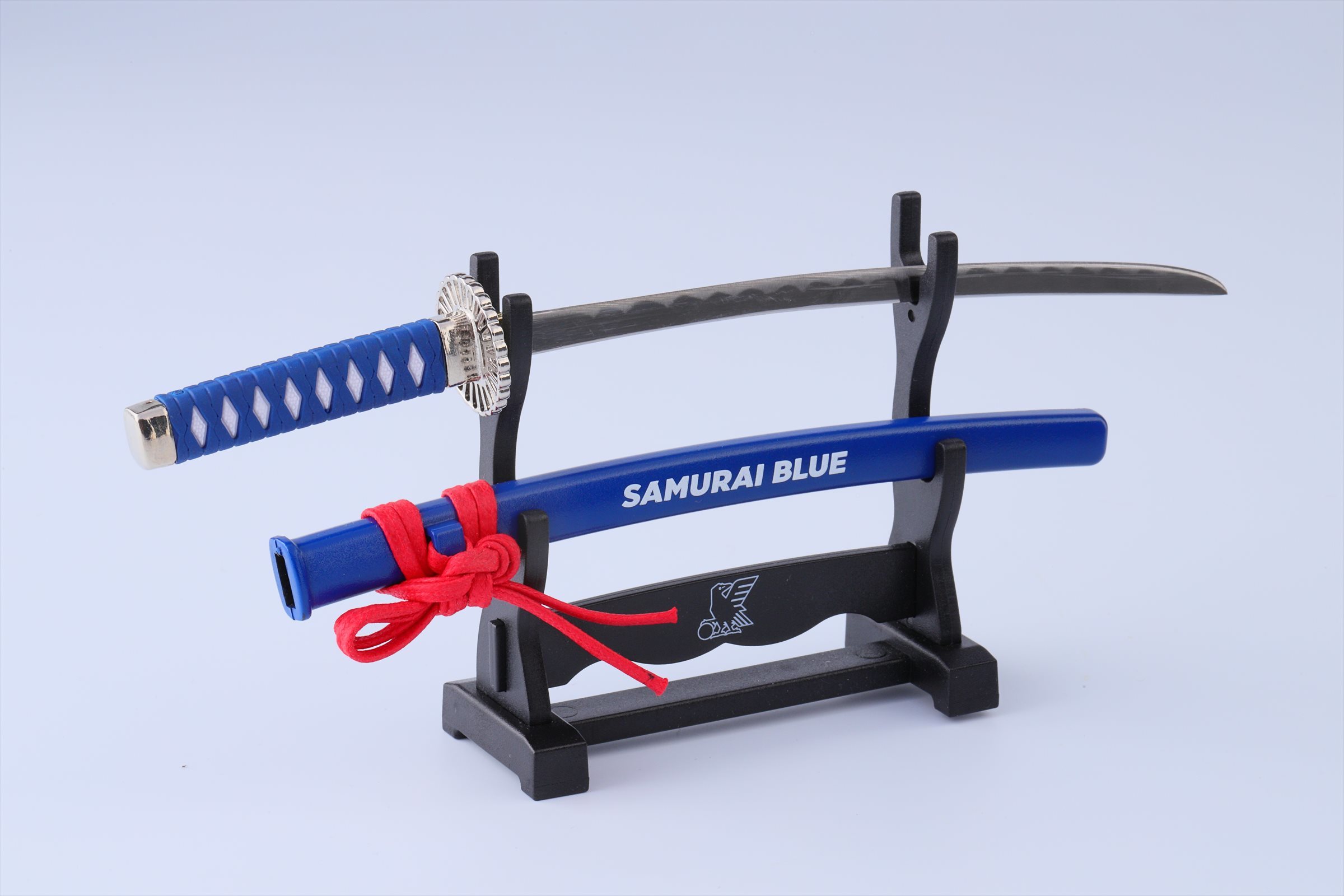 ペーパーナイフは、SAMURAI BLUEの青を基調としたイメージで作り込み、鍔も日本を象徴する菊の形状を取り入れております。掛け台には、サッカー日本代表のモチーフである三本足の烏を印刷し、ペーパーナイフとして使わない時も掛け台に置いて飾って楽しめます。