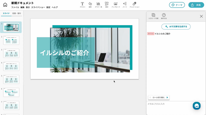 AI搭載スライド自動生成サービス「イルシル」は、スライド資料作成時間を効率化し、誰でも簡単に作ることができるサービスです。