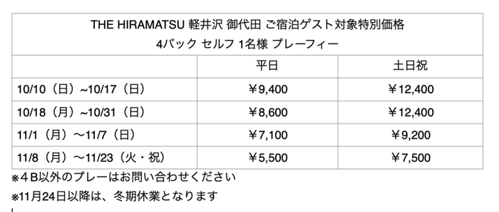 「THE HIRAMATSU 軽井沢 御代田」にご宿泊のお客様を対象にした、太平洋クラブ「軽井沢リゾート」特別価格でのご予約を10月10日より開始いたしました。10月、11月のプレーフィーは、4バックセルフで1名様平日5,500円~9,400円、土日祝7,500円~12,400円と魅力的な価格でのご提供です。プレーのご予約は、「THE HIRAMATSU 軽井沢 御代田」を通してのみ可能となります。ご希望の方はホテルまでお問い合わせください。