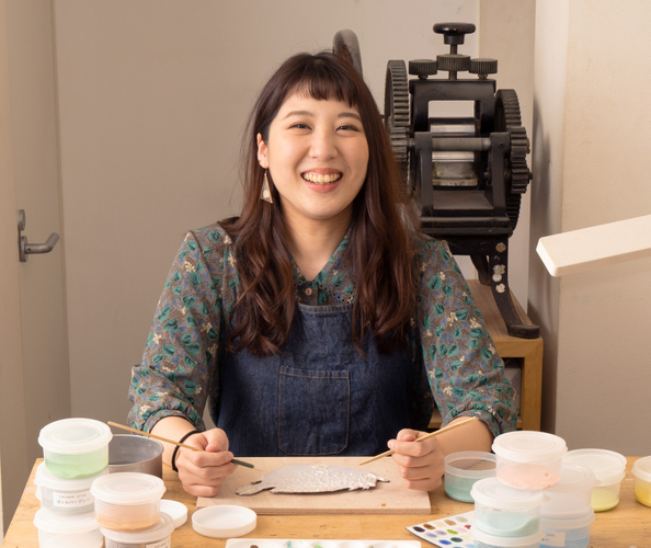 “小さい頃から様々な色でキラキラ光るガラスが大好きでした。そんな私にとって、七宝焼はガラスで自由に絵が描ける夢のような技法です。私が作品に選ぶモチーフは主に生き物や植物です。華美ではないですが、それぞれに宿る魅力に寄り添い制作することを大切にしています。”