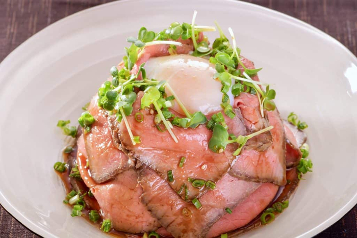 磐梯食堂では、和牛ローストビーフ丼を提供します。和牛ローストビーフ丼はご飯の上に、ローストビーフを幾重にも積み重ねた、見た目も華やかな1品です。「3密回避タイムセール」と題し、11:30~13:30の時間を避けて食事をし、レストランの混雑緩和にご協力いただいた場合、通常1,455円のところ、20%OFFの1,273円で提供します。