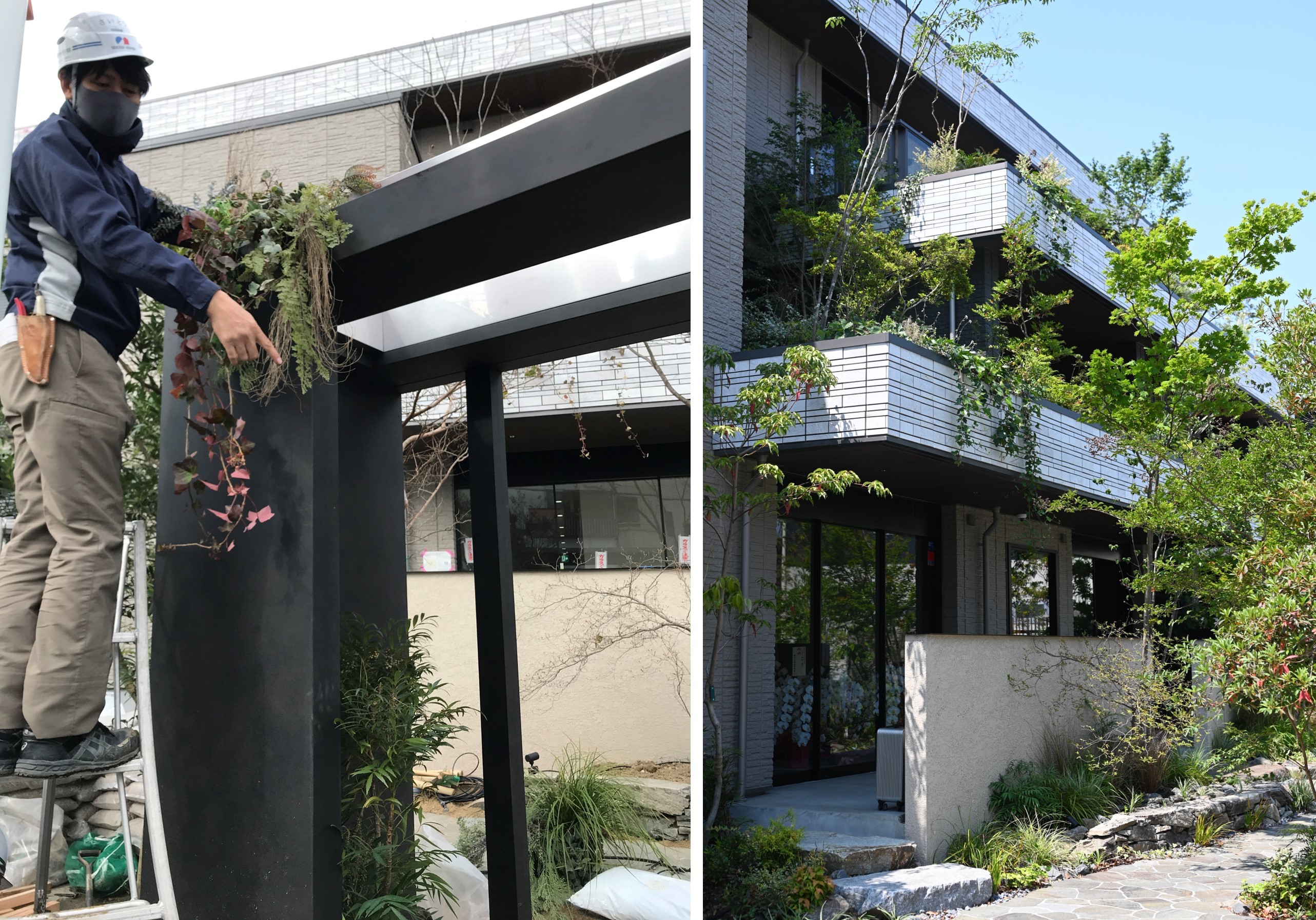 大きな特徴は、「ボタニカルゲート」。これまでのシャーメゾンは、地面に植栽するのが主流でしたが、今回は、普段使っていない2・3階のバルコニーの前や、通常は照明を設置する程度のエントランスゲート部分に緑を配置しました。「ゲートの上から緑を降り注がせたい。その緑のゲートをくぐって入居者の方々に入って欲しい。」そんな思いから、つる系のヘデラを中心に、ノシラン、シャリンバイなどを多用し、「ボタニカルゲート」が誕生しました。