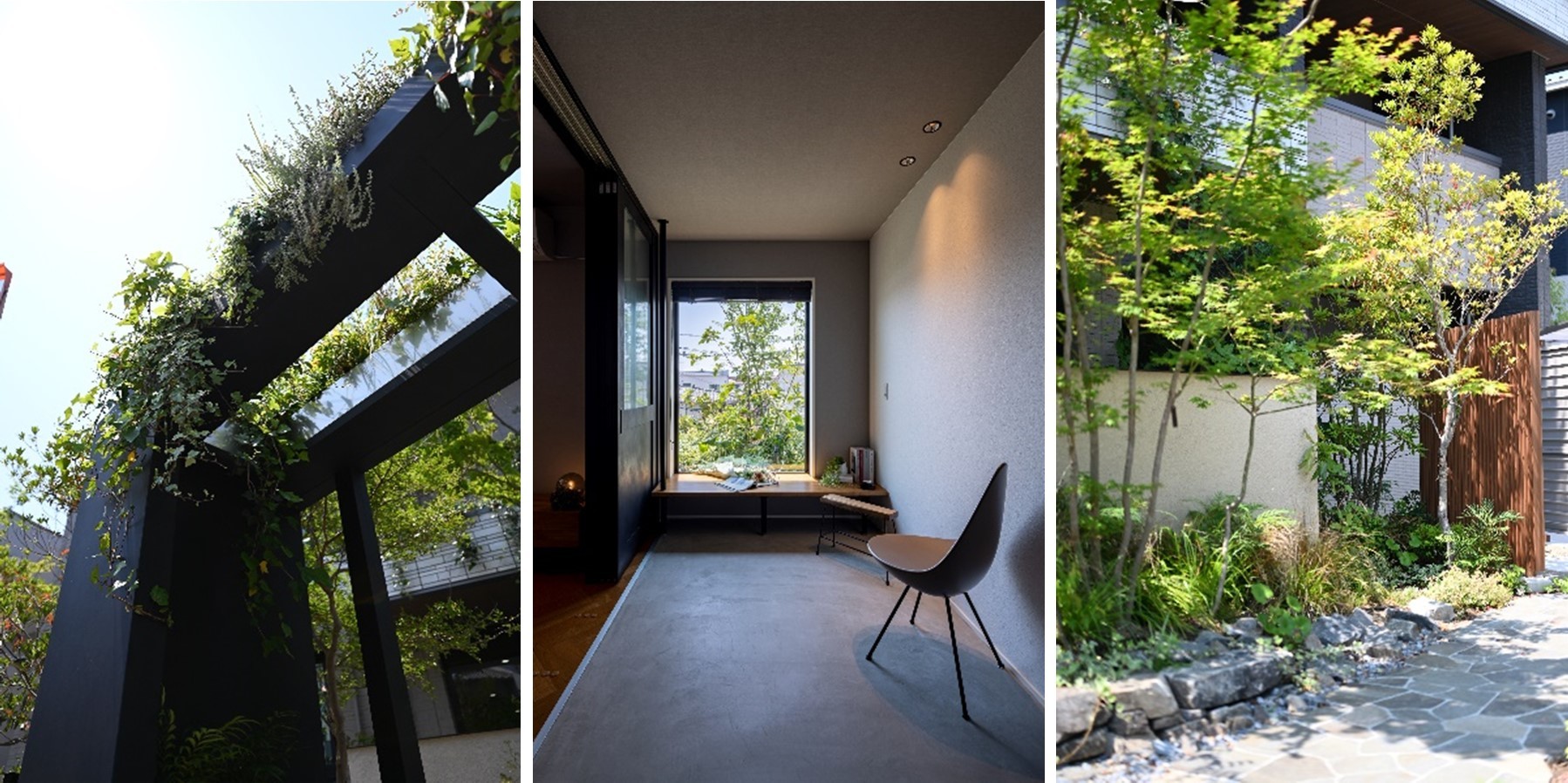そんな齋藤が突き詰めて表現した緑あふれる「シャーメゾン ガーデンズ」が2022年1月に竣工しました。オーナー様は、積水ハウスで4棟ものシャーメゾンを建てて頂いた方で、過去の実績から齋藤に強い信頼がありました。今回のオーナー様の立地は、大阪と奈良を結ぶ日本最古の官道、竹内街道に近く、神社や遺跡が多いため、地域を意識して街の雰囲気に馴染むことをご希望されましたが、それ以外は「齋藤さんにお任せします。」とおっしゃって頂いたといいます。