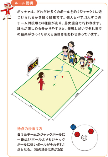 ヨーロッパで脳性麻痺者や肢体不自由者などで運動機能障がいがある人でも出来るように考案されたスポーツで、高い技術を駆使し、的(ジャック)にどれだけ自分たちのボールが近づけられるかを競う競技や、ターゲットマット等を使用してルールをアレンジすることで、レクリエーションとしても楽しめるスポーツです。