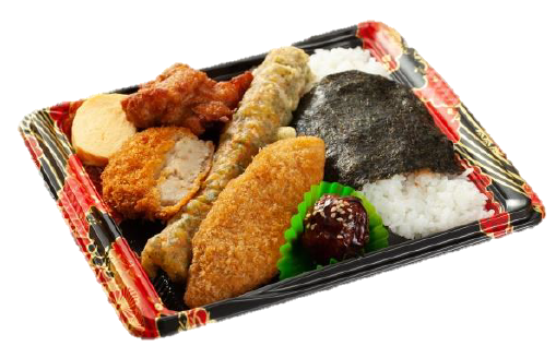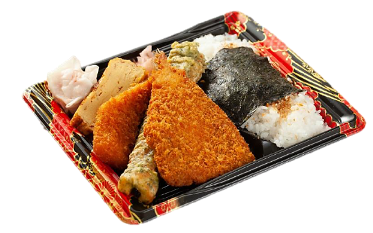 大きなあじフライ・ちくわ磯辺天ぷらなどボリューム満点の弁当に仕上げました。