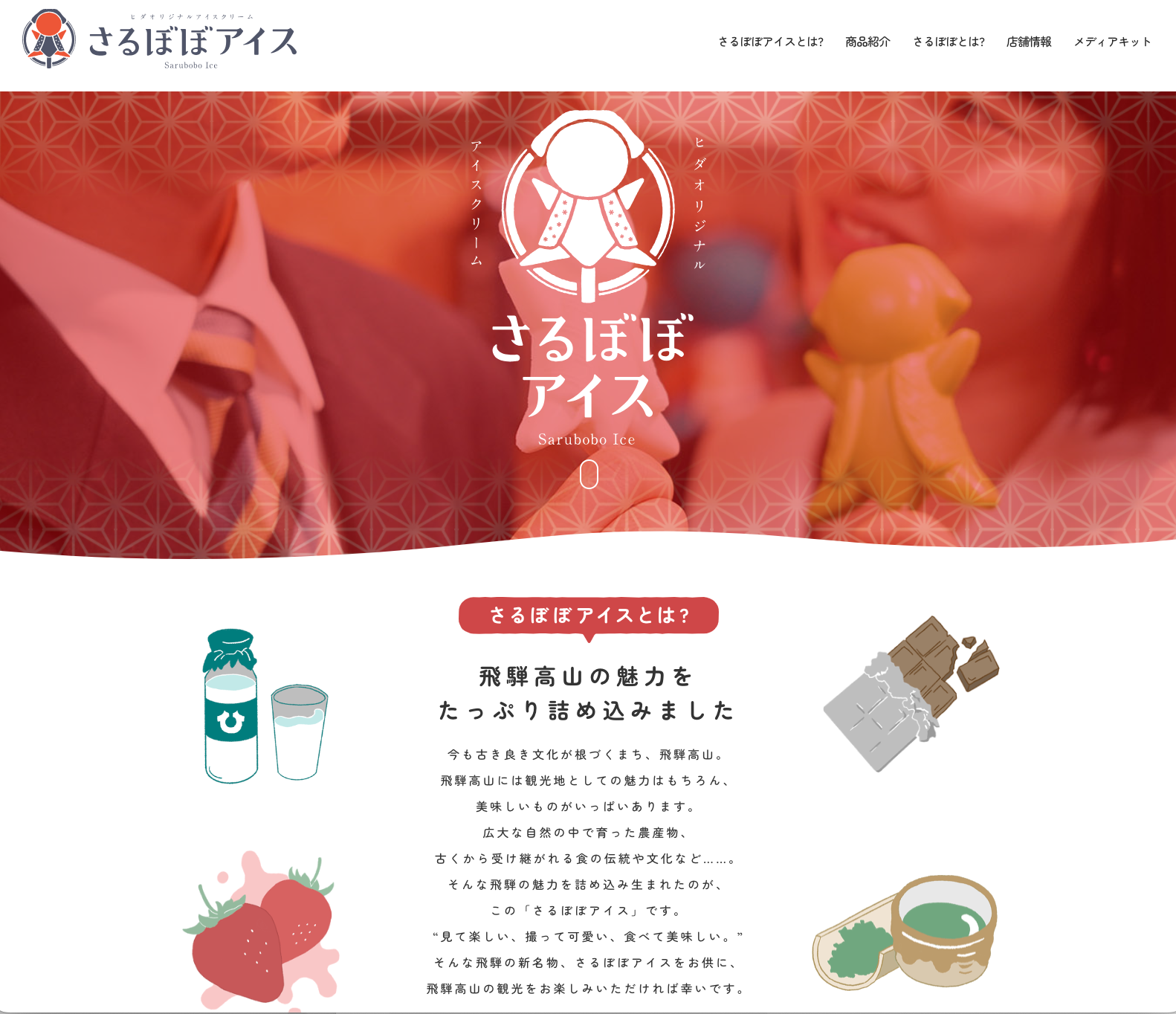 さるぼぼアイスは、飛騨高山のデザイン事務所 株式会社ゴーアヘッドワークスが開発した商品です。「私たちは、デザイン業を通して企業のブランドづくりのお手伝いをさせていただいております。飛騨高山のさまざまなデザインに関わらせていただく中で「もっとデザインの力で地域に貢献したい!」と思い立ち、飛騨高山の新たな名物を開発する企画を発足させました」と、代表取締役の蒲優祐(かばゆうすけ)さんは語る。ご自身もデザイナーとして、日々、お客様のデザインをしている事から。今回は、原材料や製造業者、卸売業者まで、たくさんの飛騨の企業様に関わっていただき、さまざまな試行錯誤の結果「さるぼぼアイス」が誕生しました。さるぼぼアイスは私たちが地域に根付きさまざまな企業様と作り上げた集大成です。観光客の方からはもちろん、地域の方にも愛されるアイスを目指して活動してまいりますので、これからのさるぼぼアイスの発展を見守っていただければ幸いです。と語る。