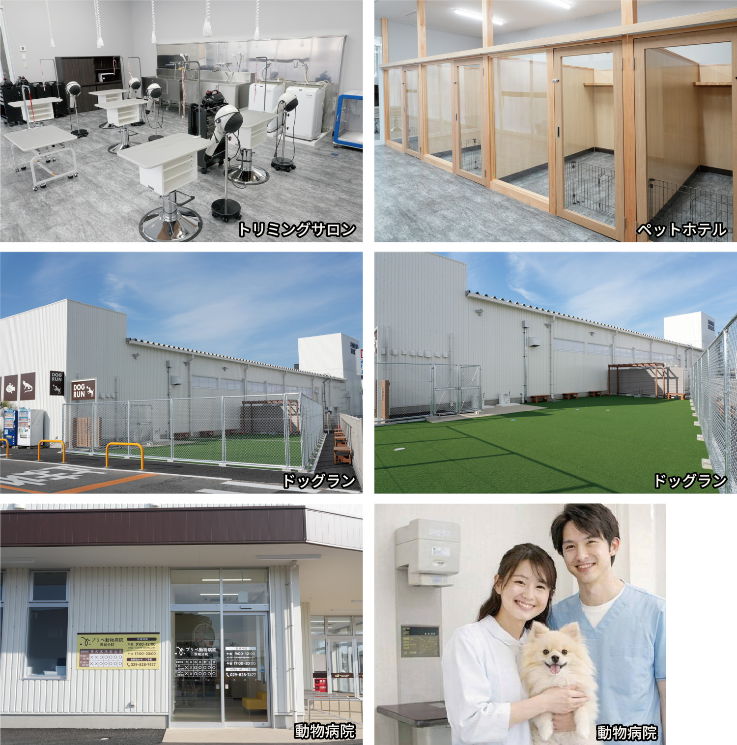 快適で通いやすい店舗を目指し、トリミングサロン、ペットホテル、セルフウォッシュルームやドッグランなどの設備を整備。さらに動物病院併設によりペットライフを総合的にサポートします。