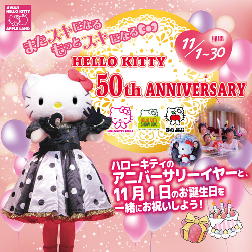 株式会社サンリオの人気キャラクター「ハローキティ」は、2024年に生誕50周年を迎えます。そこで、淡路島にある 3つのハローキティの施設「AWAJI HELLO KITTY APPLE LAND」では、ハローキティとの特別グリーティングやバースデー公演、50周年限定グッズの販売など、ハローキティ 生誕50周年をお祝いするイベント『HELLO KITTY 50th ANNIVERSARY』を2023年11月1日(水)から2024年10月31日(木)まで開催いたします。