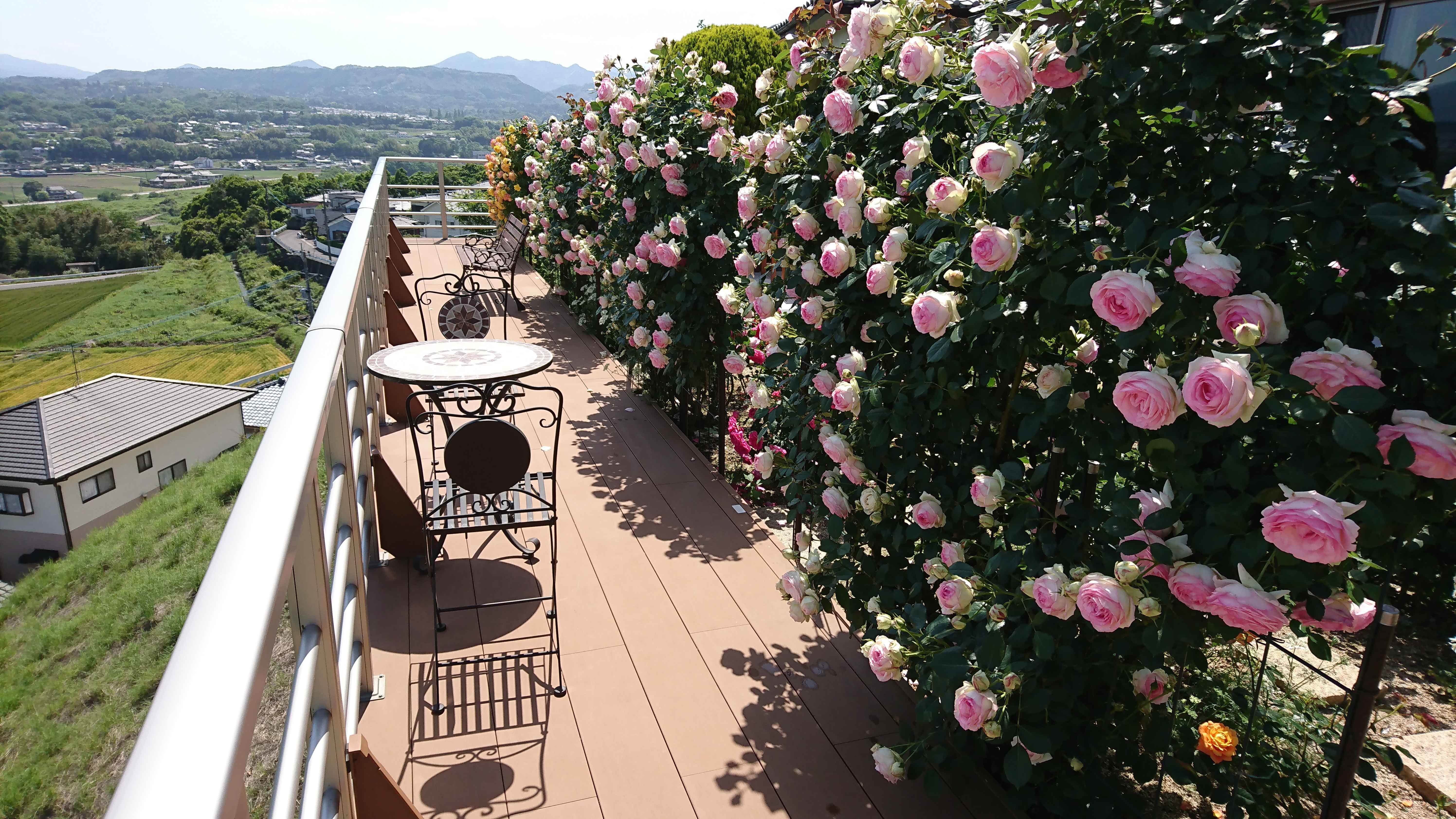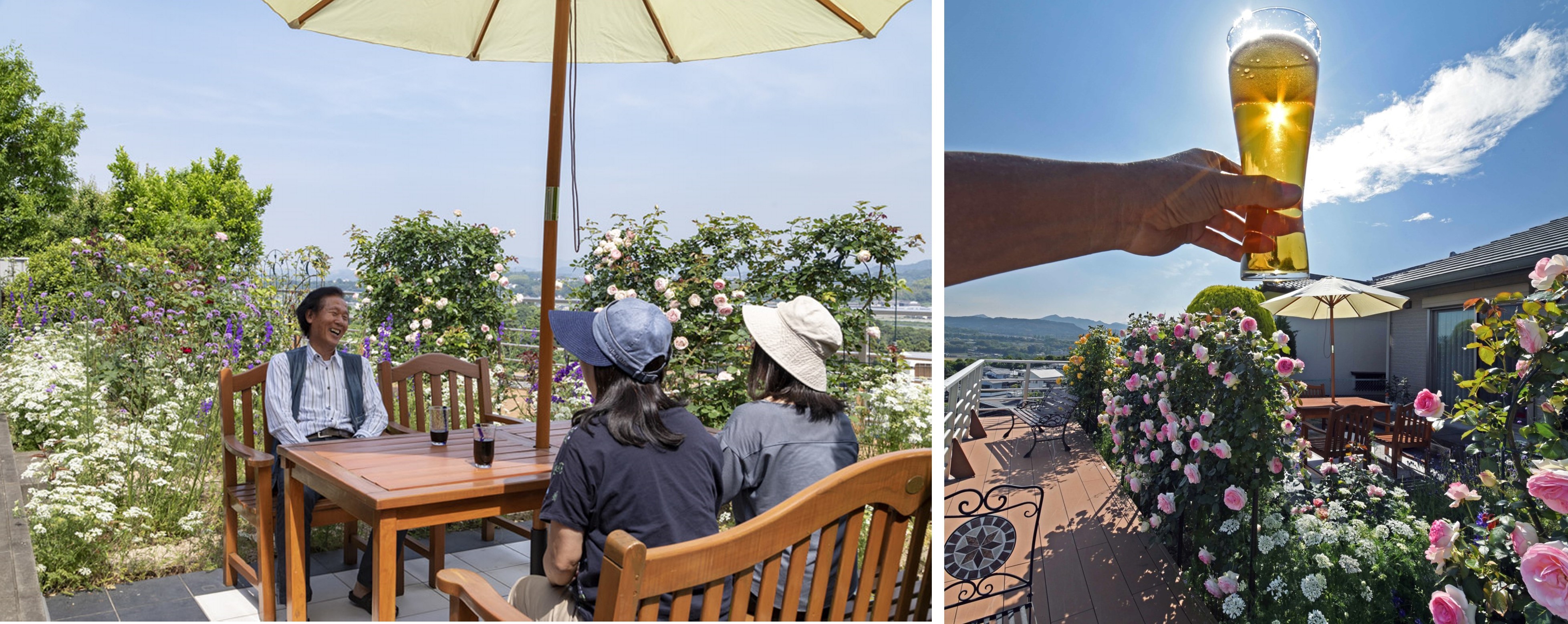 庭づくり以外にも、写真に陶芸と、趣味が多彩な平野さんの家には、共通の趣味を通して知り合った仲間も多く訪れます。バラ好きも多くいることから、毎年5月には「天空のウッドデッキ」でバラと食事やビールを楽しみながら、バラの育て方などを相談し合う「バラ会」を開催するのが恒例になっています。