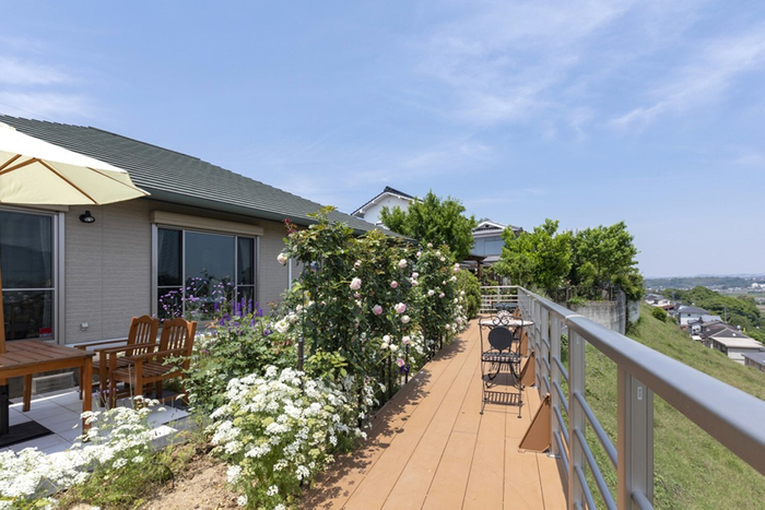 庭の南側は斜面に面しており、高台の眺望を活かしたことから、「天空のウッドデッキ」と名付けました。今では、平野さんの一番のお気に入りの場所となっています。