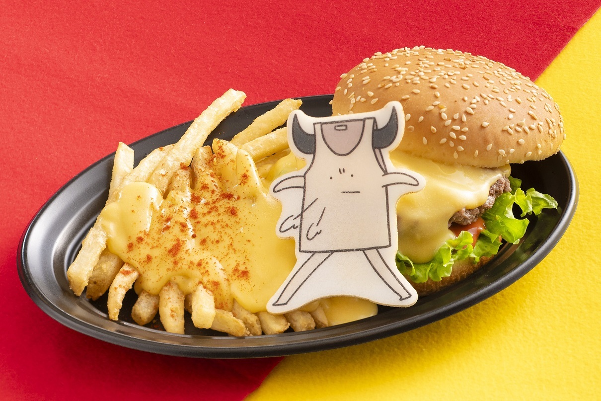ヤバイぐらいチーズがたっぷりかかったチーズバーガーだよ。ポテトとタンクトップくんもついてるよ。