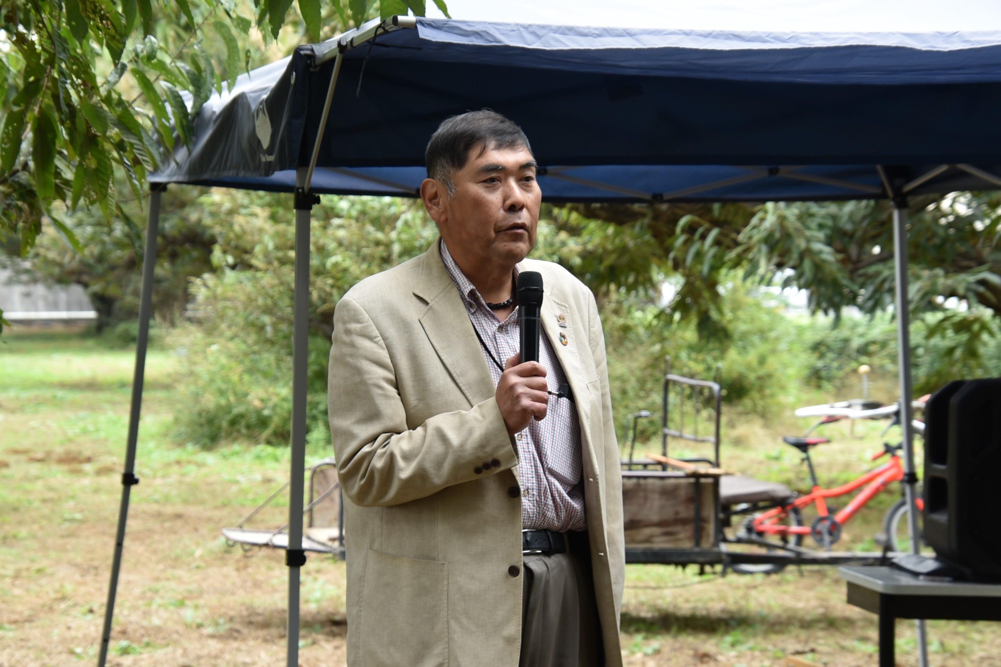 稲刈り作業を前に、氏田稔農学部長、小原章裕専務理事、附属農場長の林利哉教授があいさつ。このうち、氏田学部長はAIの技術の発達に触れたうえで「人が集まり、実りのある秋を実感して感謝することが大切です」などと参加者に語り掛けました。